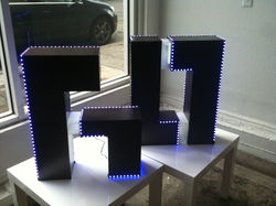 Sculpture inspired by neon signage. The shape of letters are broken down into geometrical forms that can be taken apart and reassembled. The pieces are shown in both daylight and night.